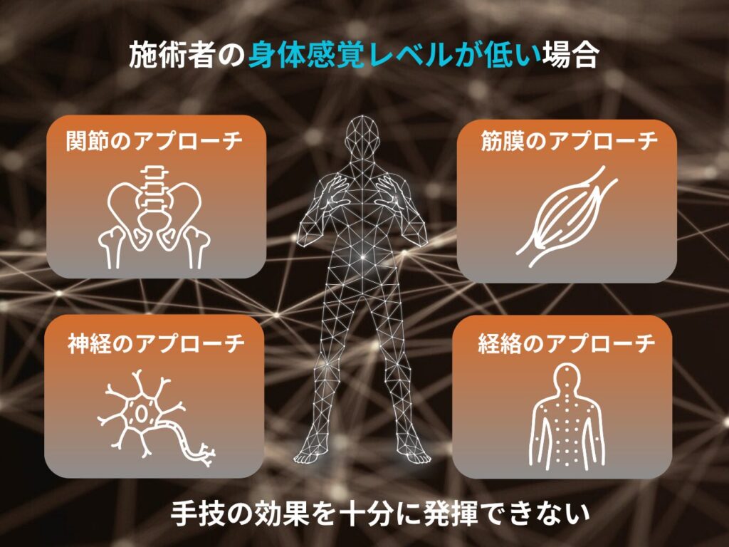 どういうことかというと、どれだけ素晴らしい手技を習って頭で理解していても、それを扱うあなたの手の感覚、身体のレベルが低いと、その手技での効果を十分に発揮することができません。